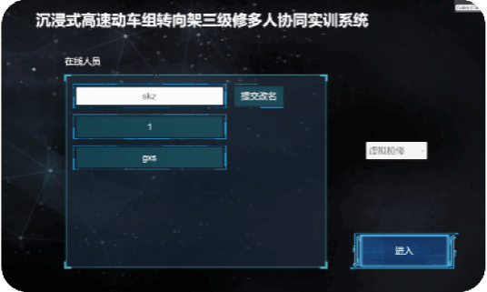 沉浸式动车组转向架多人协同实训系统最多可支持二十人同时在线协同实训。需要多人协同时,由一人创建服务器,其余人连接同一局域网进入页面,即可自动进入同一服务器进行多人协同实训。